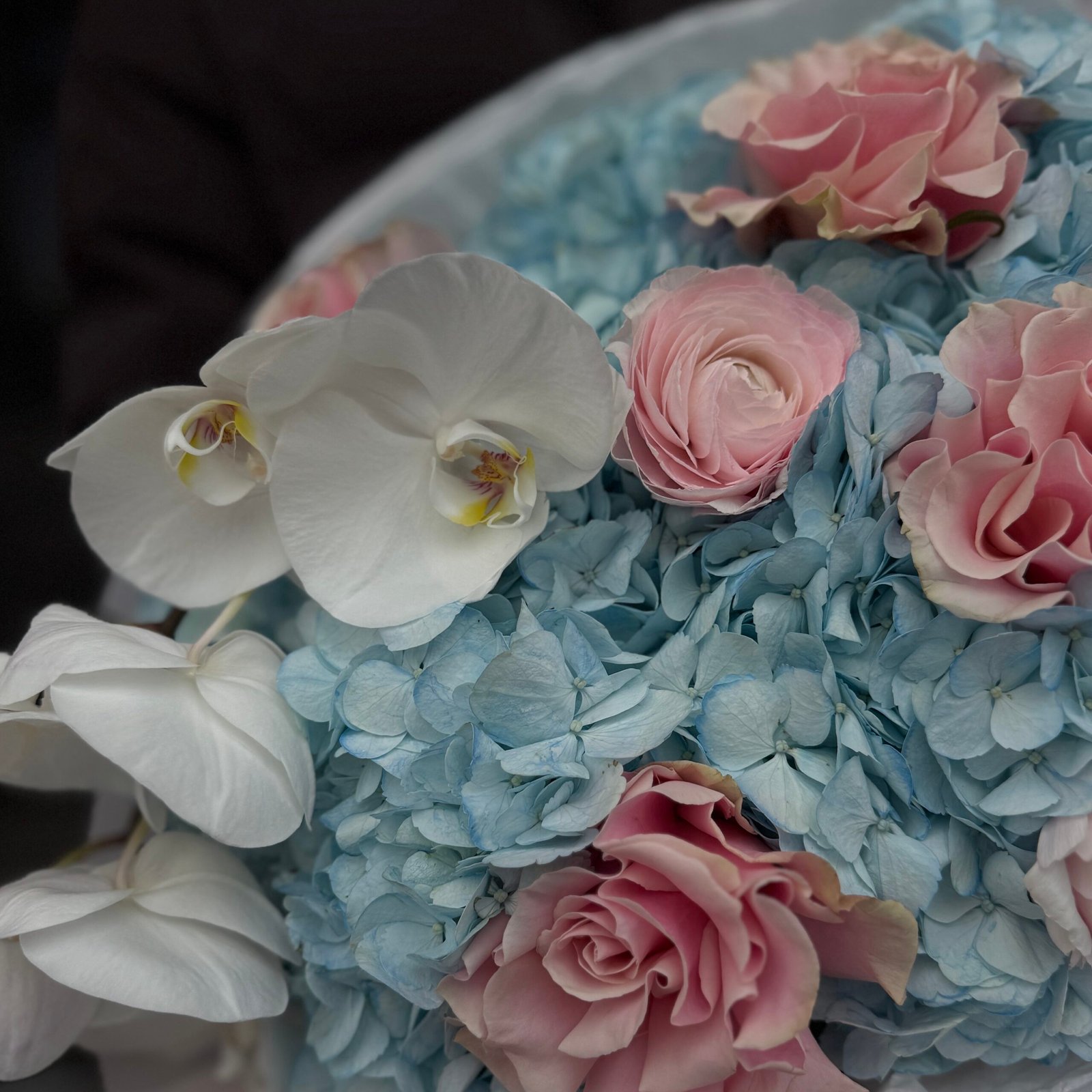 Skład bukietu: hortensja niebieska, róże w odcieniu pudrowego różu, ranunkulusy (jaskry), biała orchidea.