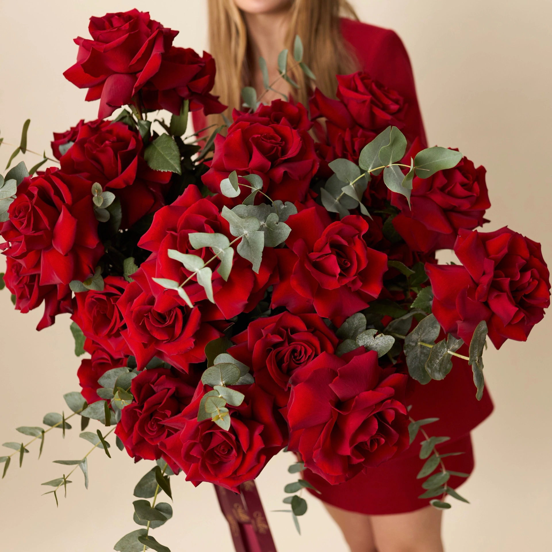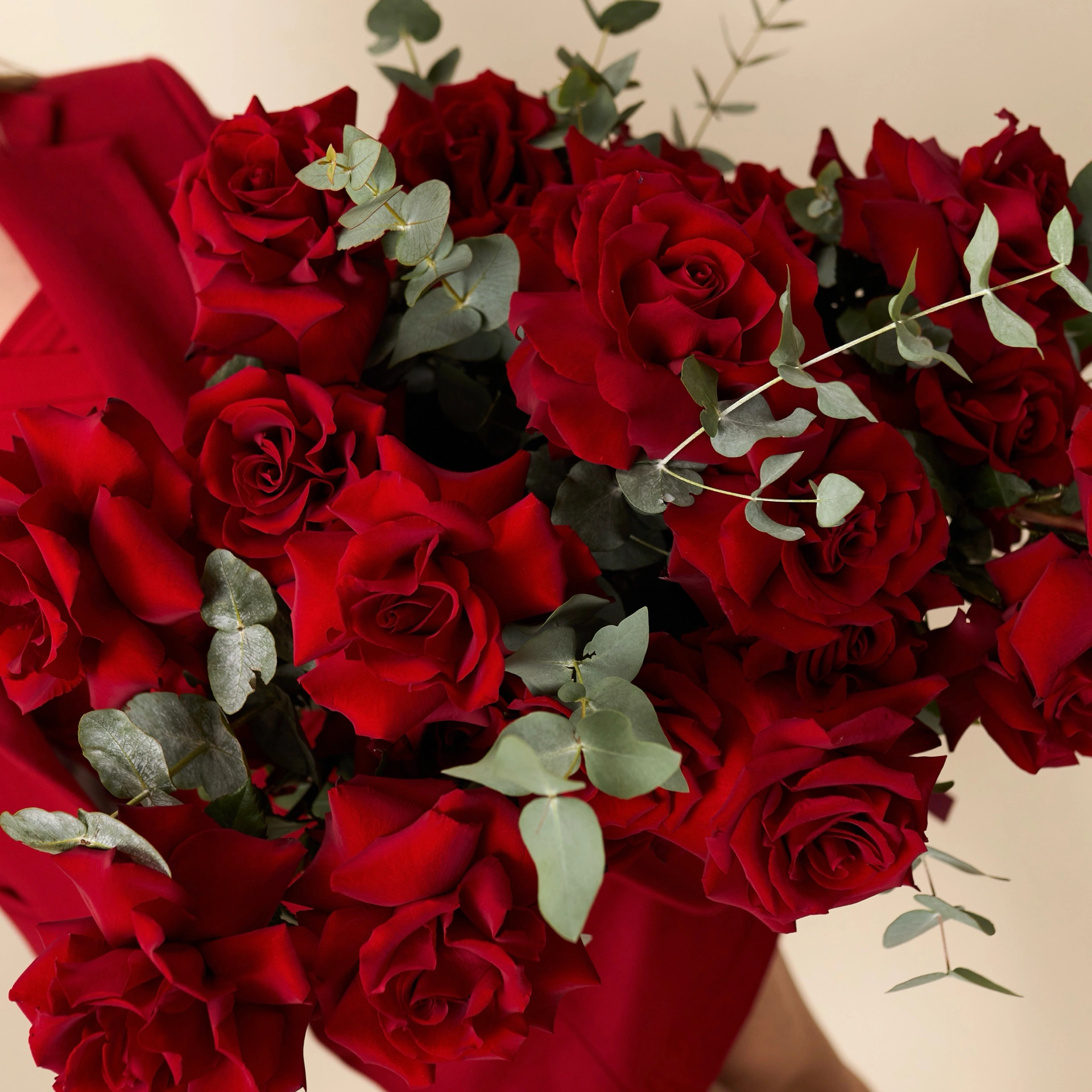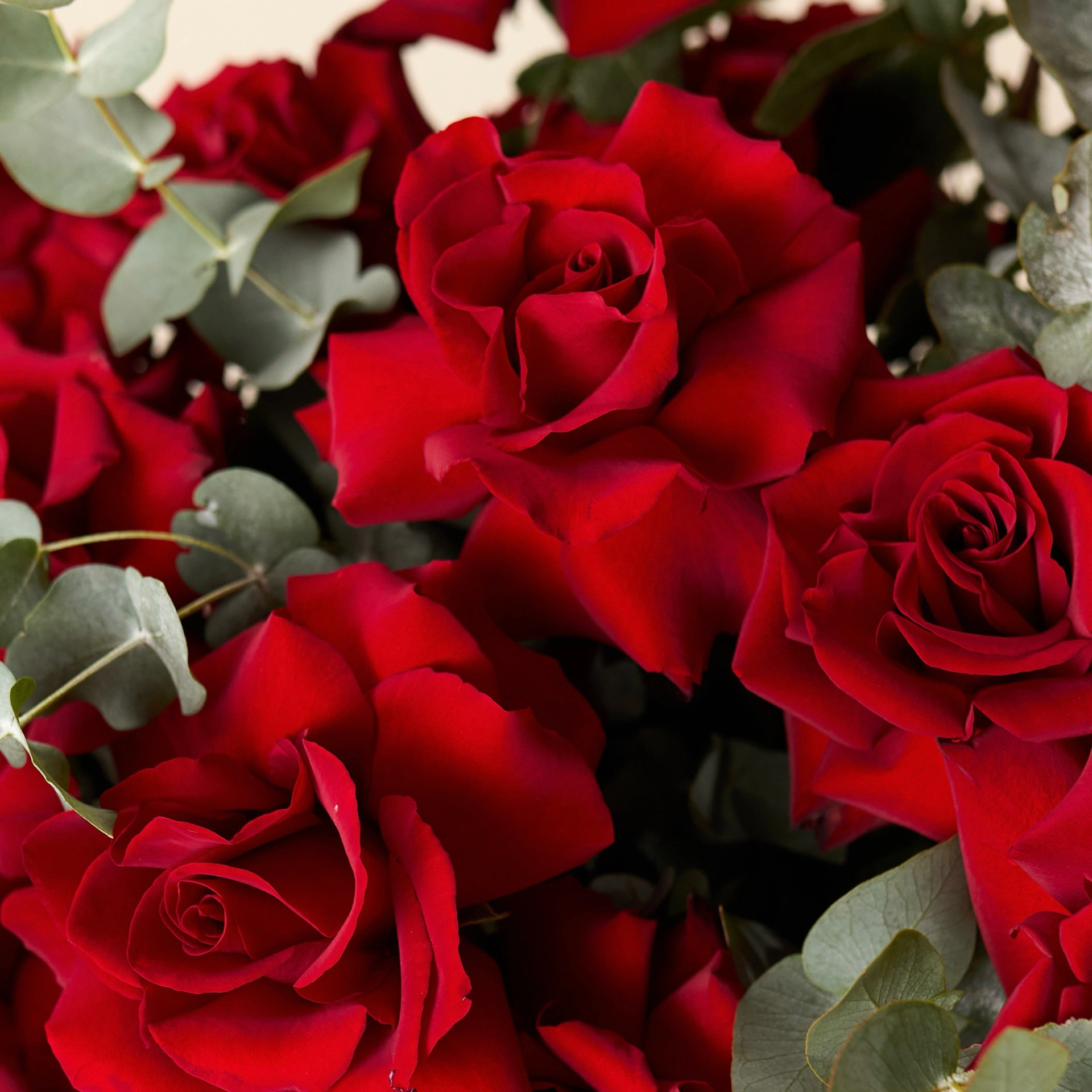 Wyrazisty i elegancki bukiet z intensywnie czerwonych róż, uzupełniony świeżym eukaliptusem.