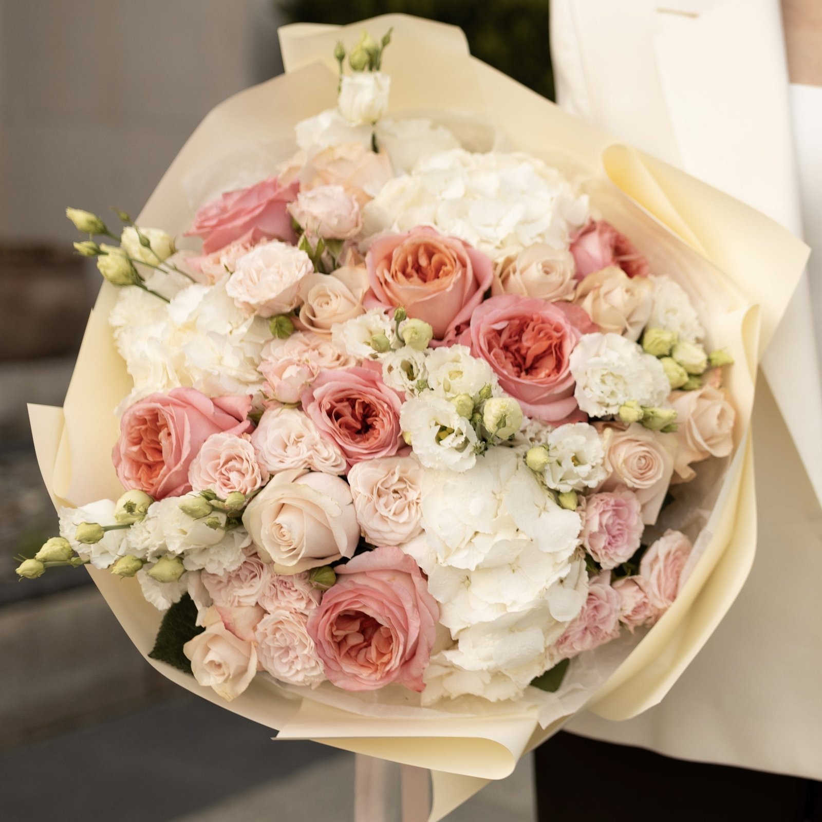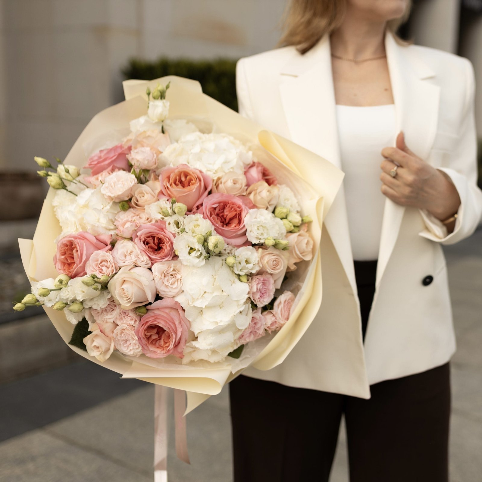 Elegancka i wyważona kompozycja w odcieniach pudrowego różu, brzoskwini i bieli. Bukiet emanuje subtelnością, lekkością i nowoczesnym charakterem. Idealny na ślub, rocznicę lub wyjątkowy prezent z klasą.