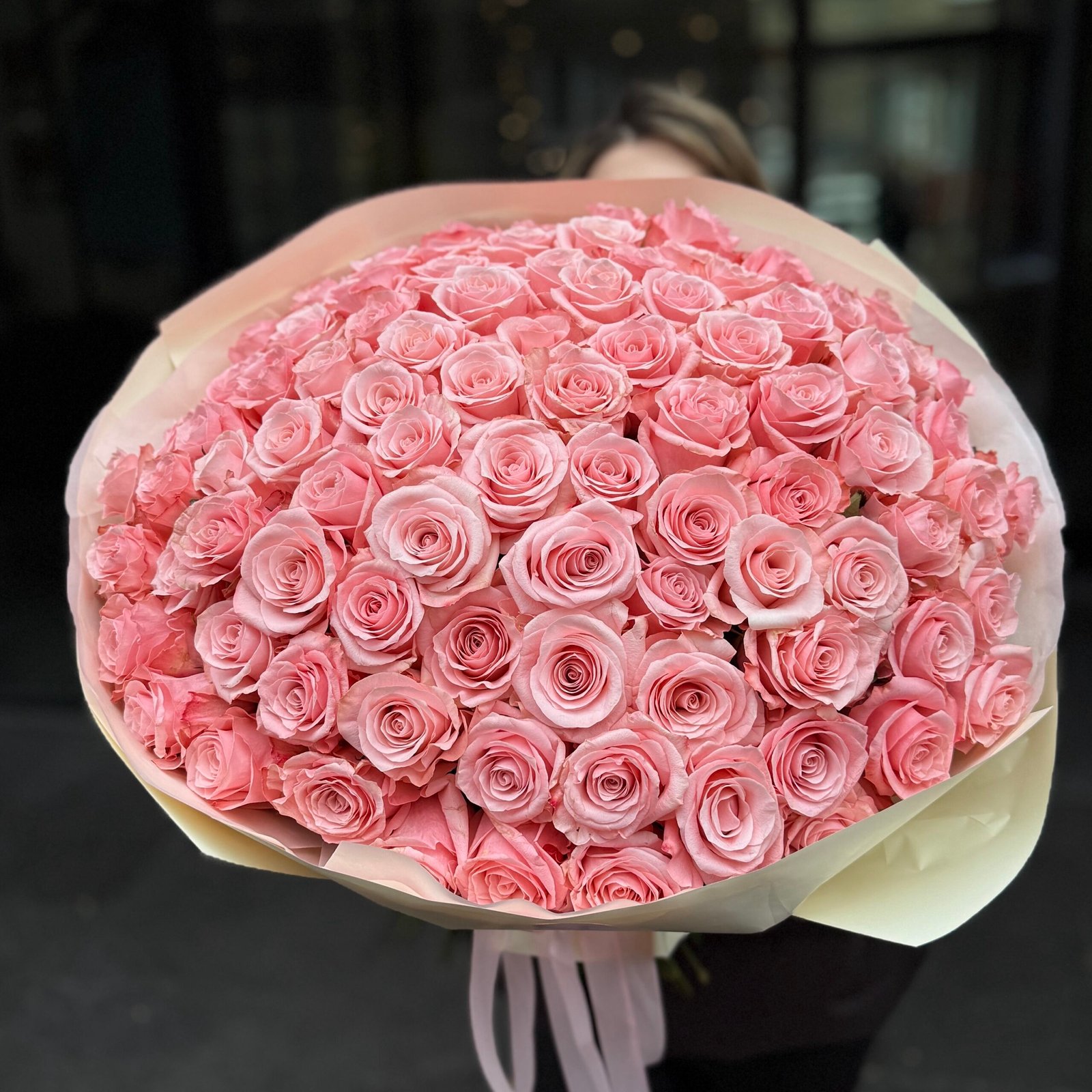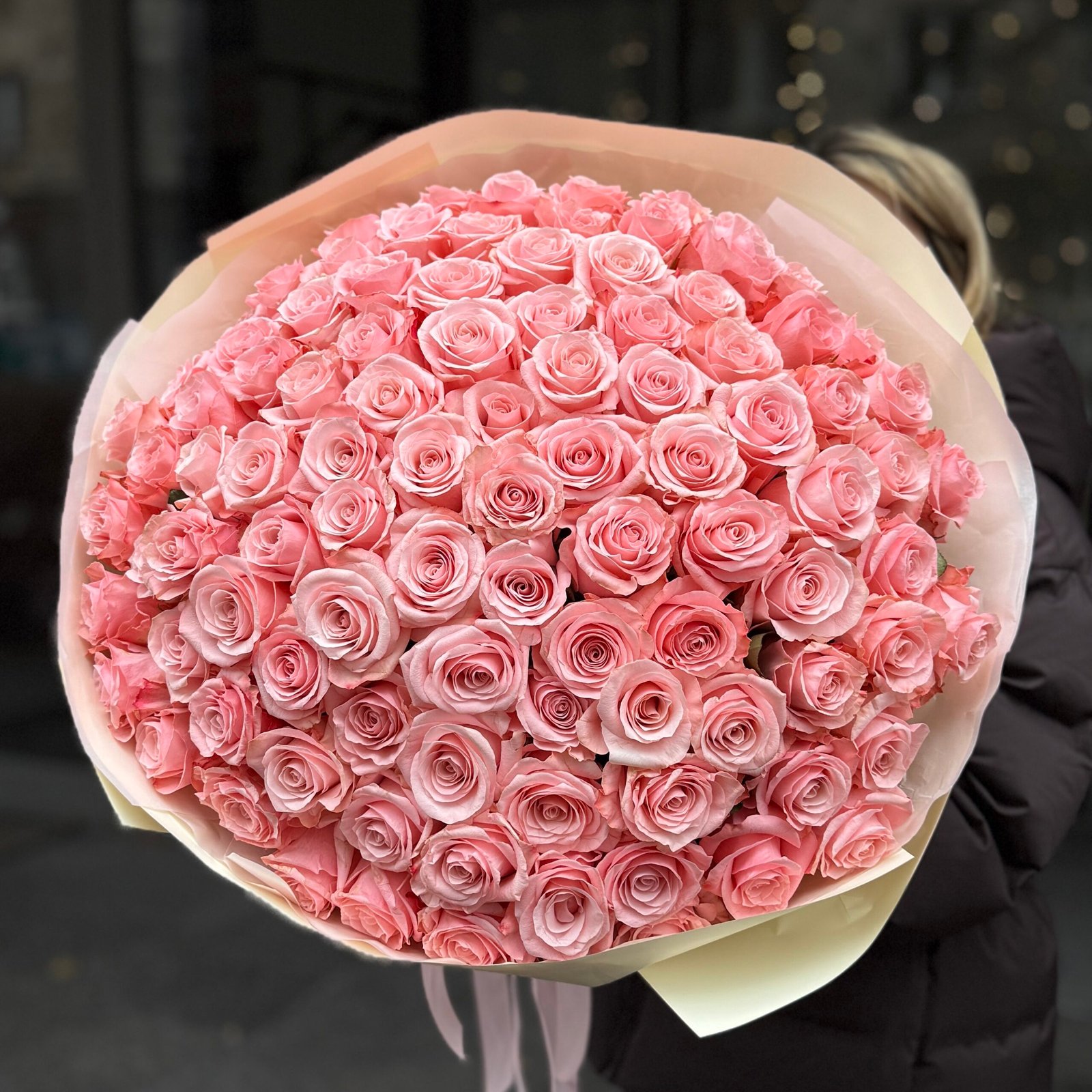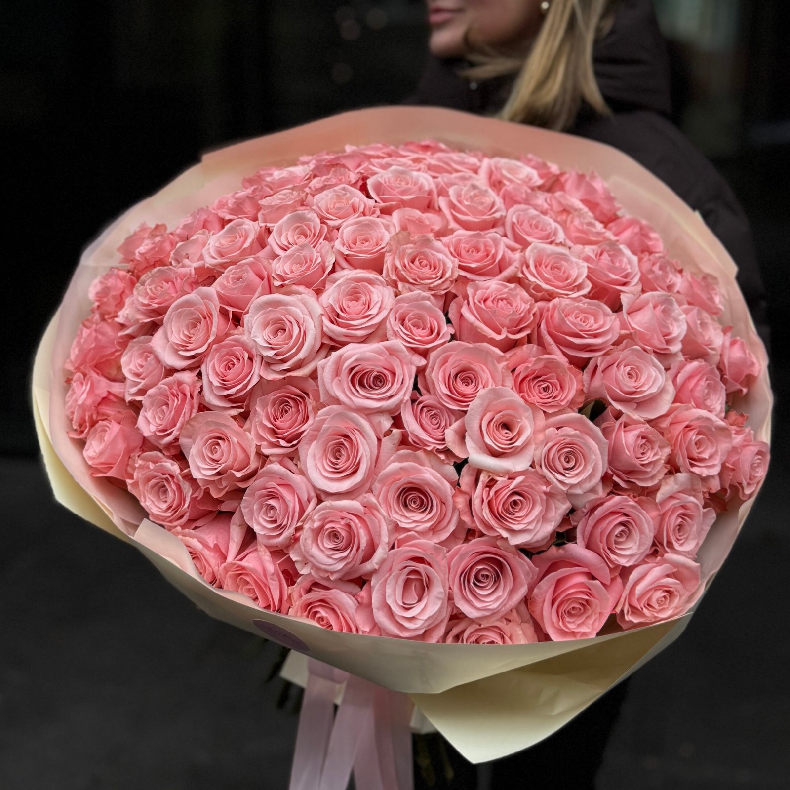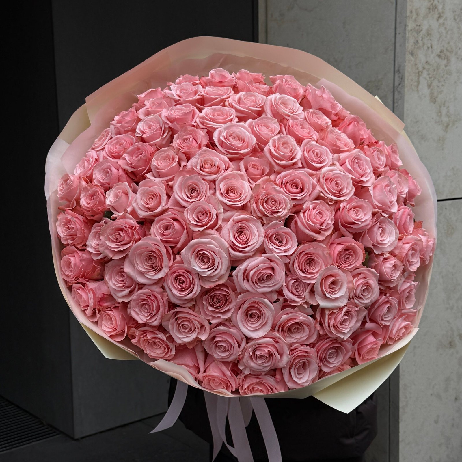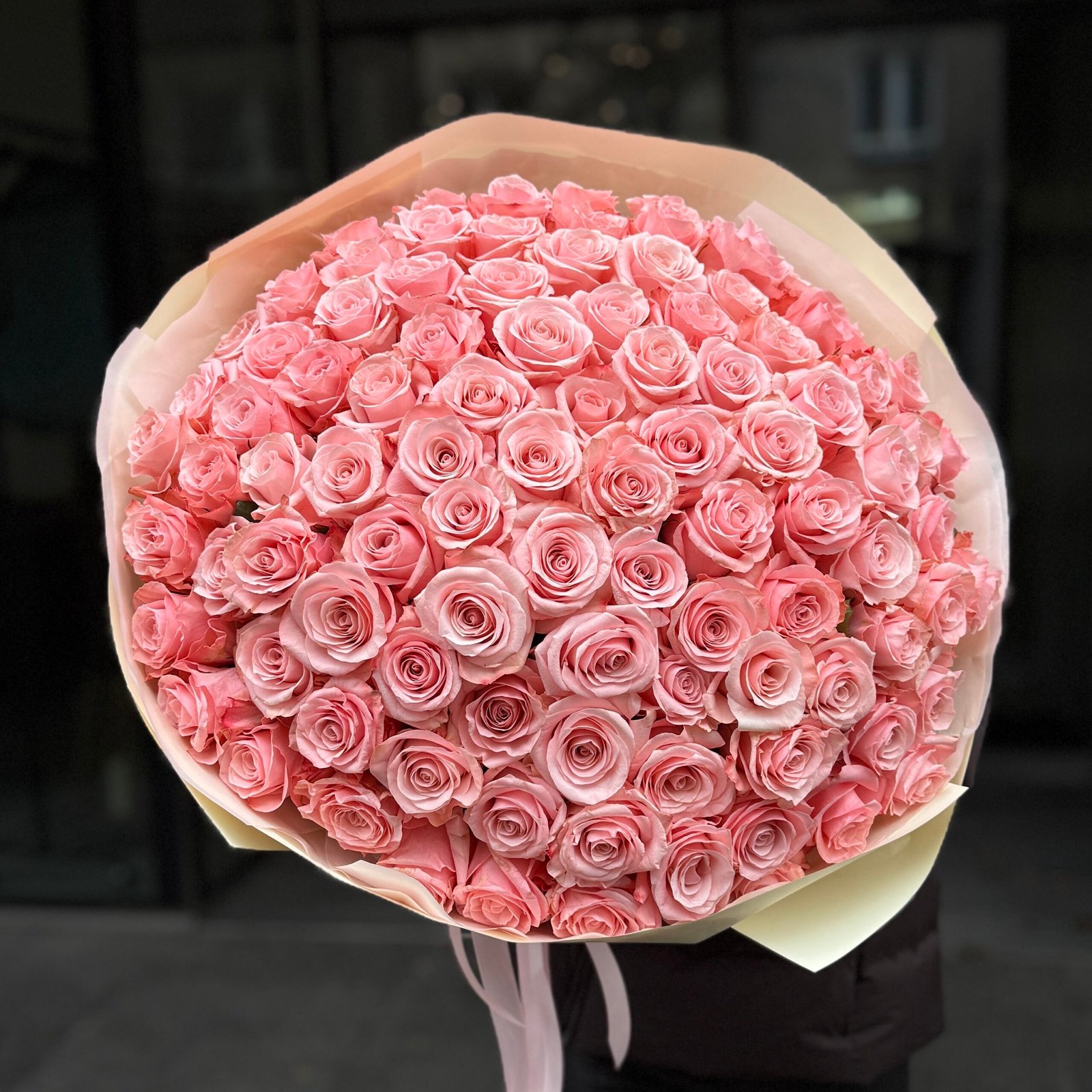 Elegancki, imponujący mono-bukiet z różowych róż, ułożony w idealnie zwartą, kulistą formę. Każda róża została starannie dobrana pod względem koloru i stopnia rozkwitu, aby całość prezentowała się harmonijnie i luksusowo.