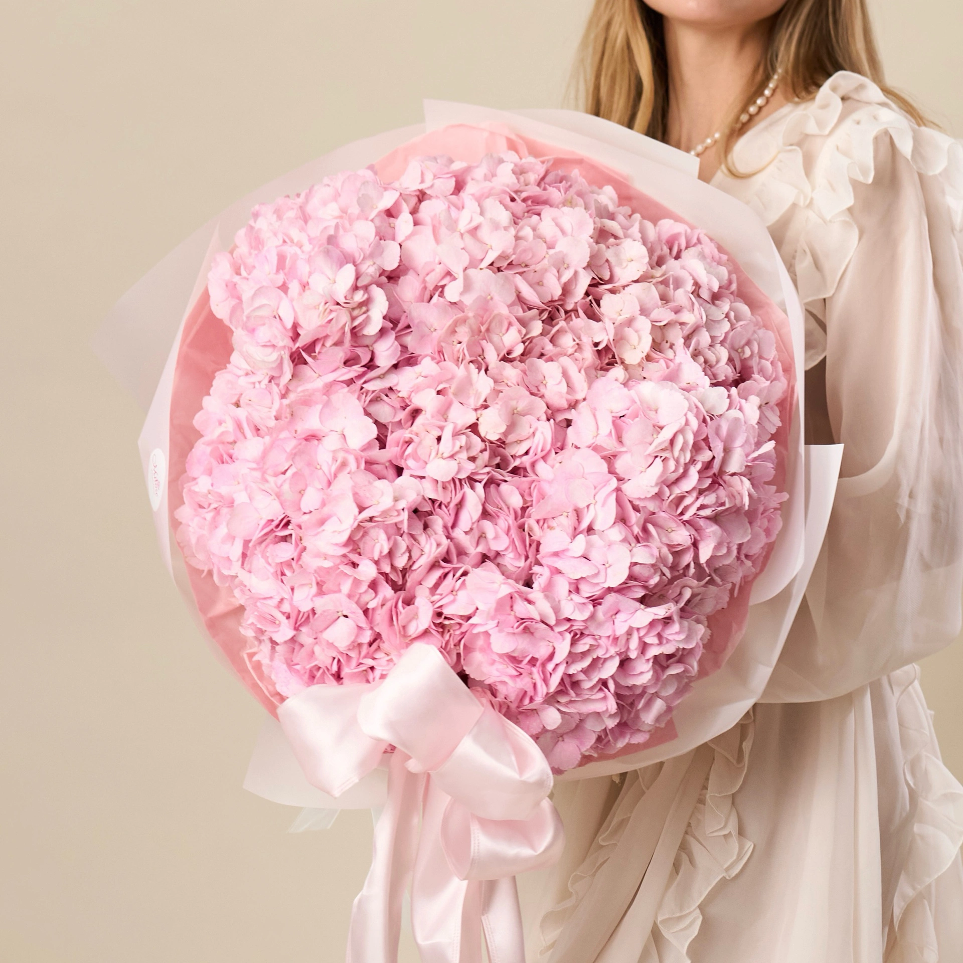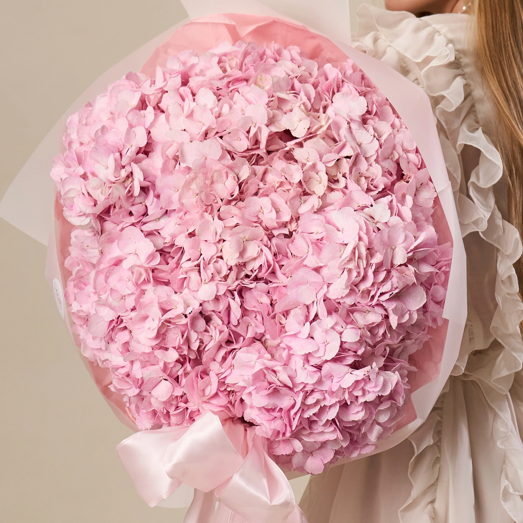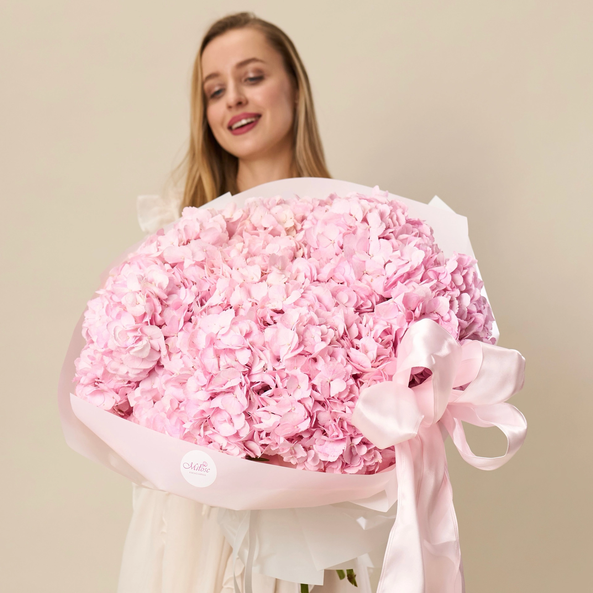 Duży, miękki w formie bukiet z różowych hortensji – delikatny, a jednocześnie bardzo wyrazisty.
