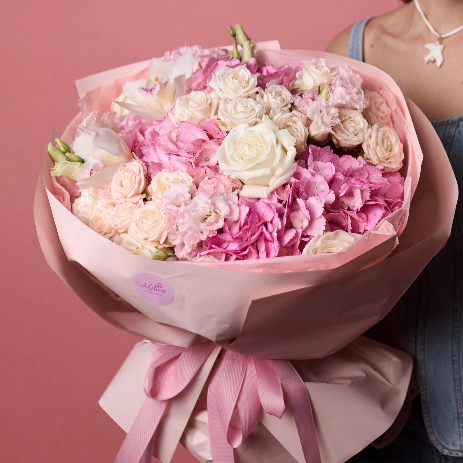 Kompozycja w delikatnej palecie różu i kremowych odcieni. Objętość hortensji łączy się z różami i subtelną eustomą, a orchidea cymbidium stanowi wyrazisty akcent.