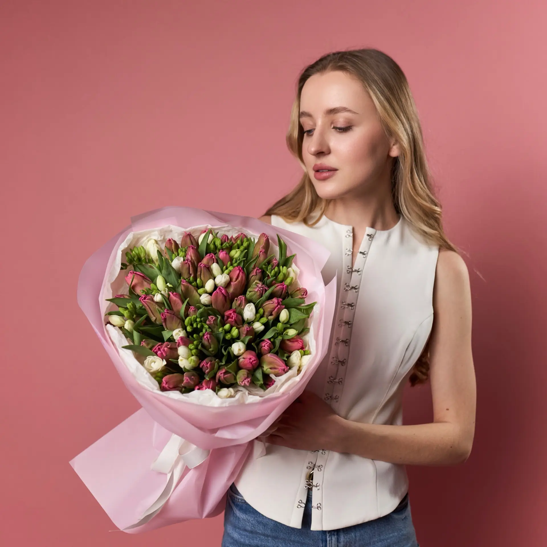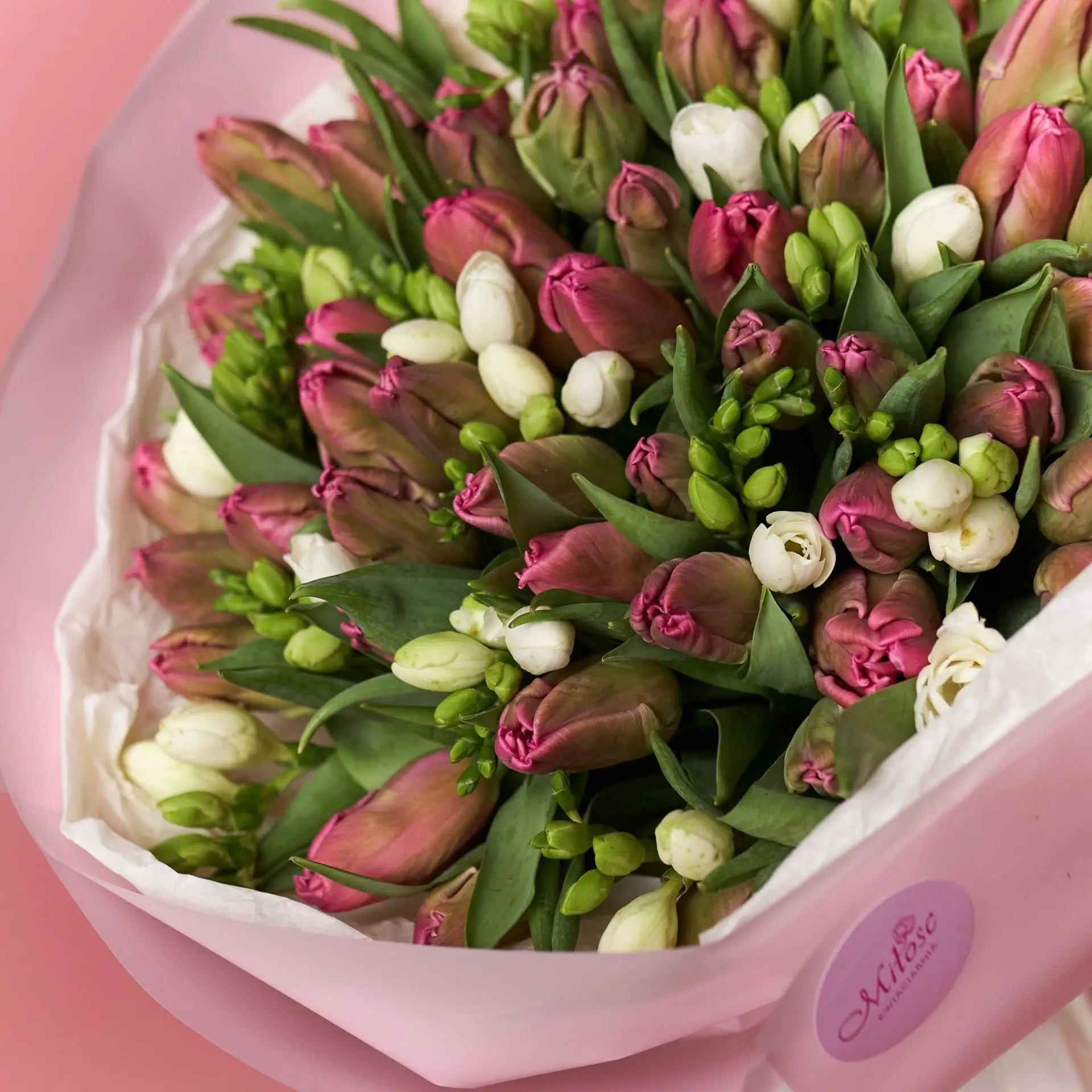 Bukiet inspirowany wiosenną świeżością i naturalną lekkością. Kompozycja zbudowana na tulipanach w subtelnych odcieniach różu oraz delikatnych frezjach, które wprowadzają rytm drobnych pąków i naturalną strukturę.