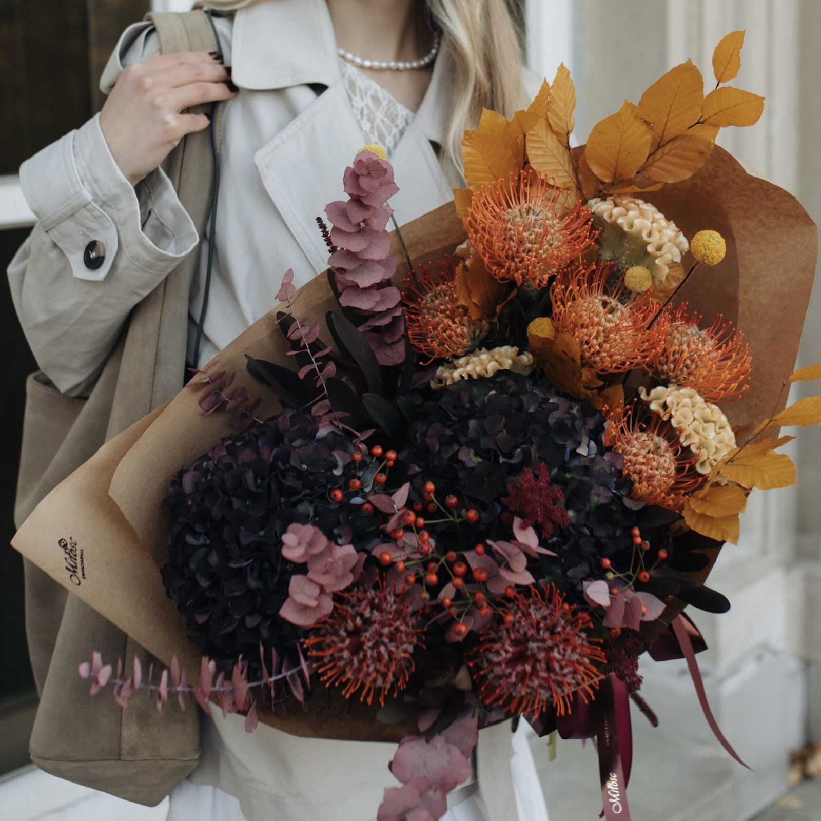 Ten bukiet łączy nowoczesną egzotykę z klasyką jesieni: obfite hortensje, ogniste leucospermum, miękkie fale celozji oraz szlachetną paletę eukaliptusa w odcieniach burgundu i śliwki.