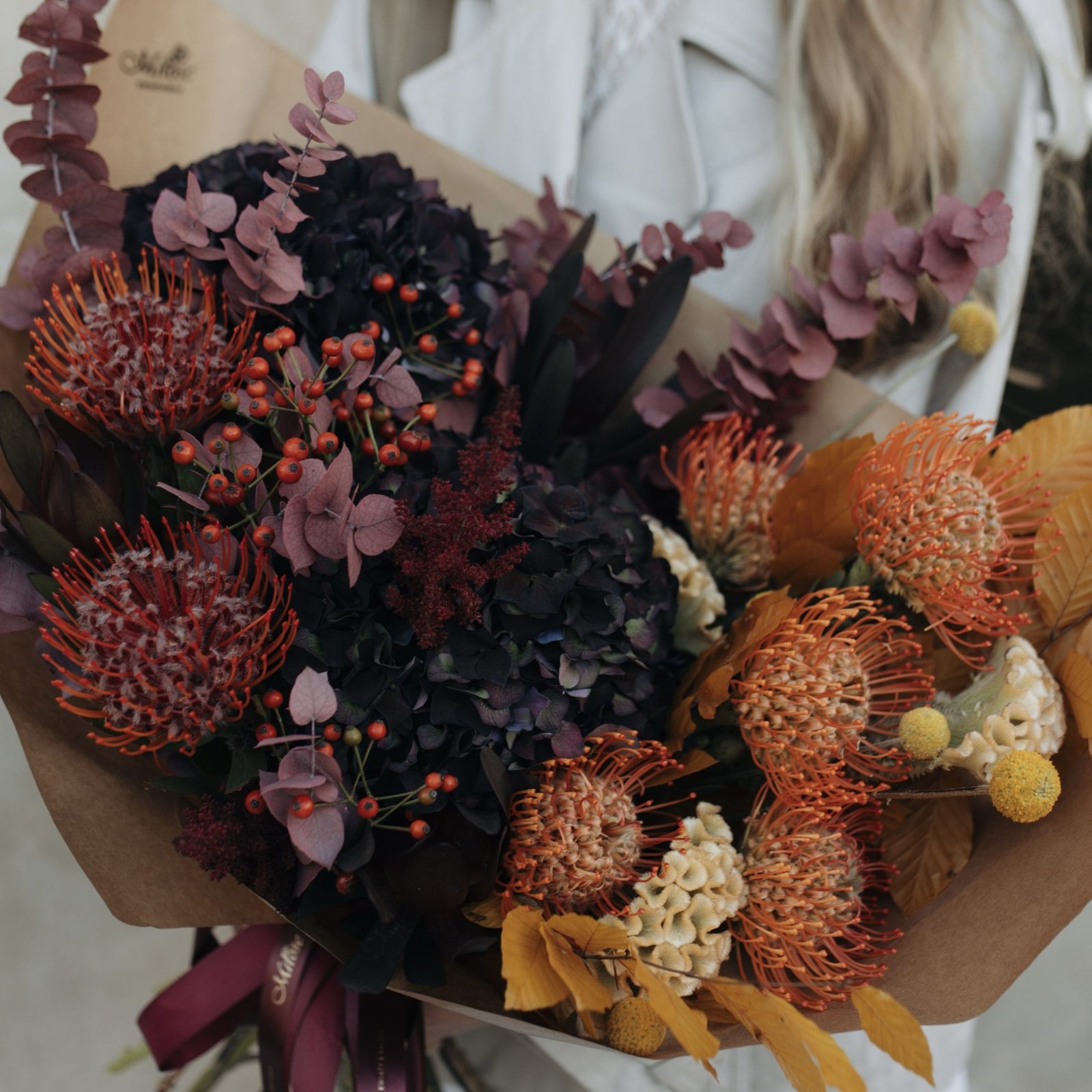 Skład bukietu: hortensja bordowa, leucospermum, celozja, kraspedia, jesienne liście, eukaliptus, dodatki sezonowe.