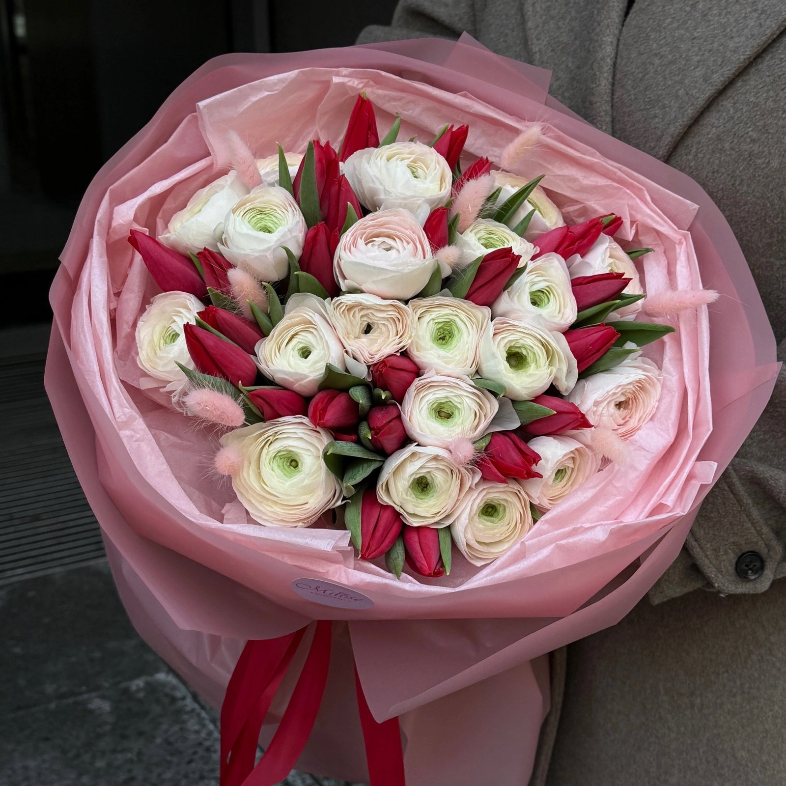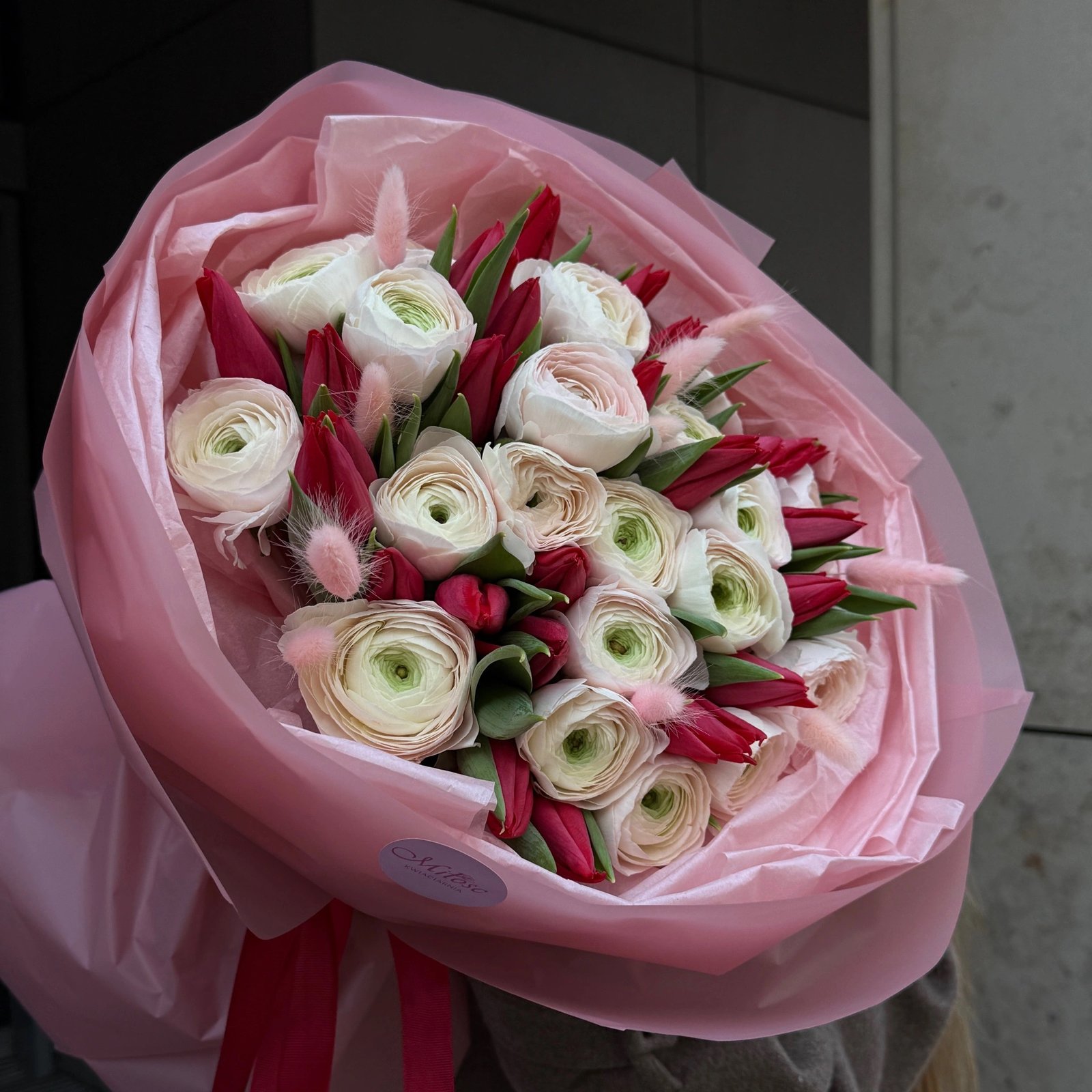Wyrafinowany, nowoczesny bukiet oparty na kontrastach. Kremowe i pudrowe ranunkulusy zestawione z intensywnie czerwonymi tulipanami tworzą kompozycję pełną charakteru, a jednocześnie bardzo harmonijną. Delikatne akcenty i miękka, różowa oprawa nadają całości lekkości i klasy.