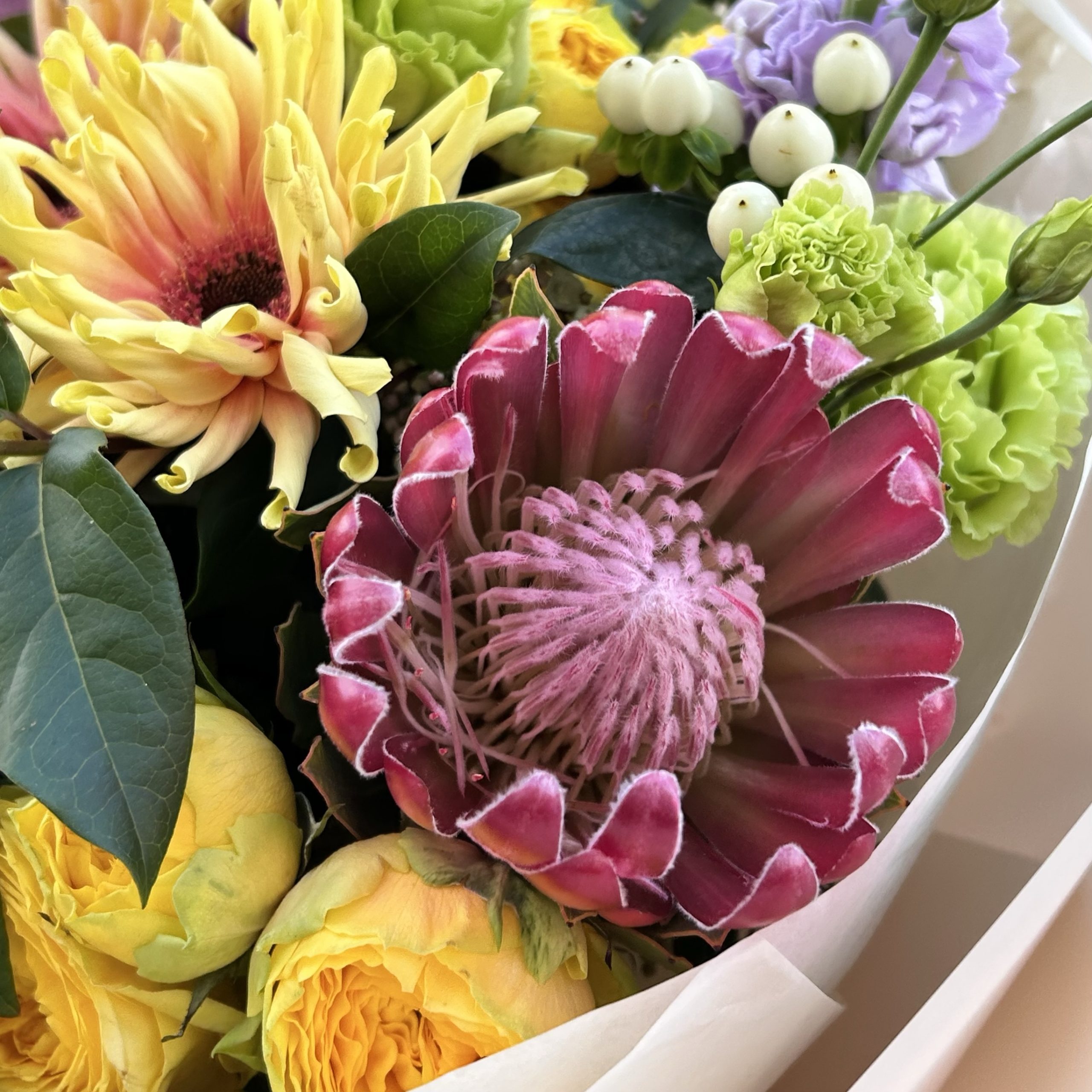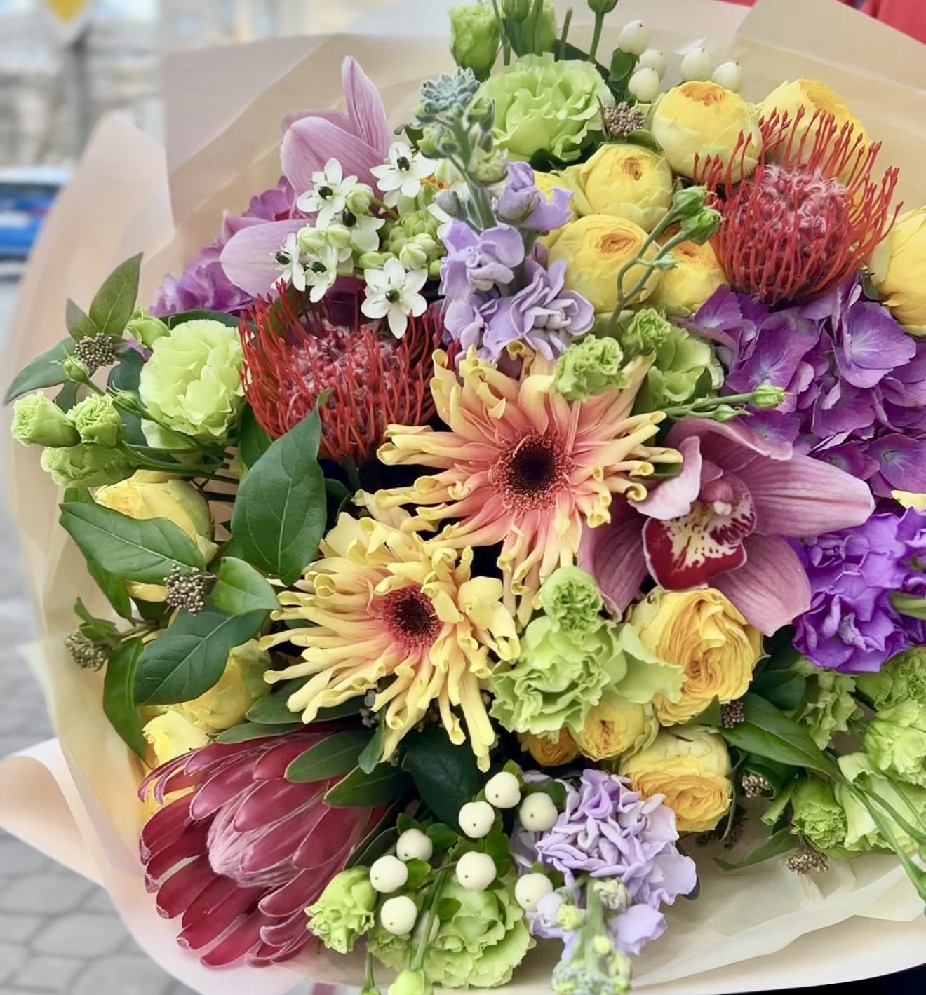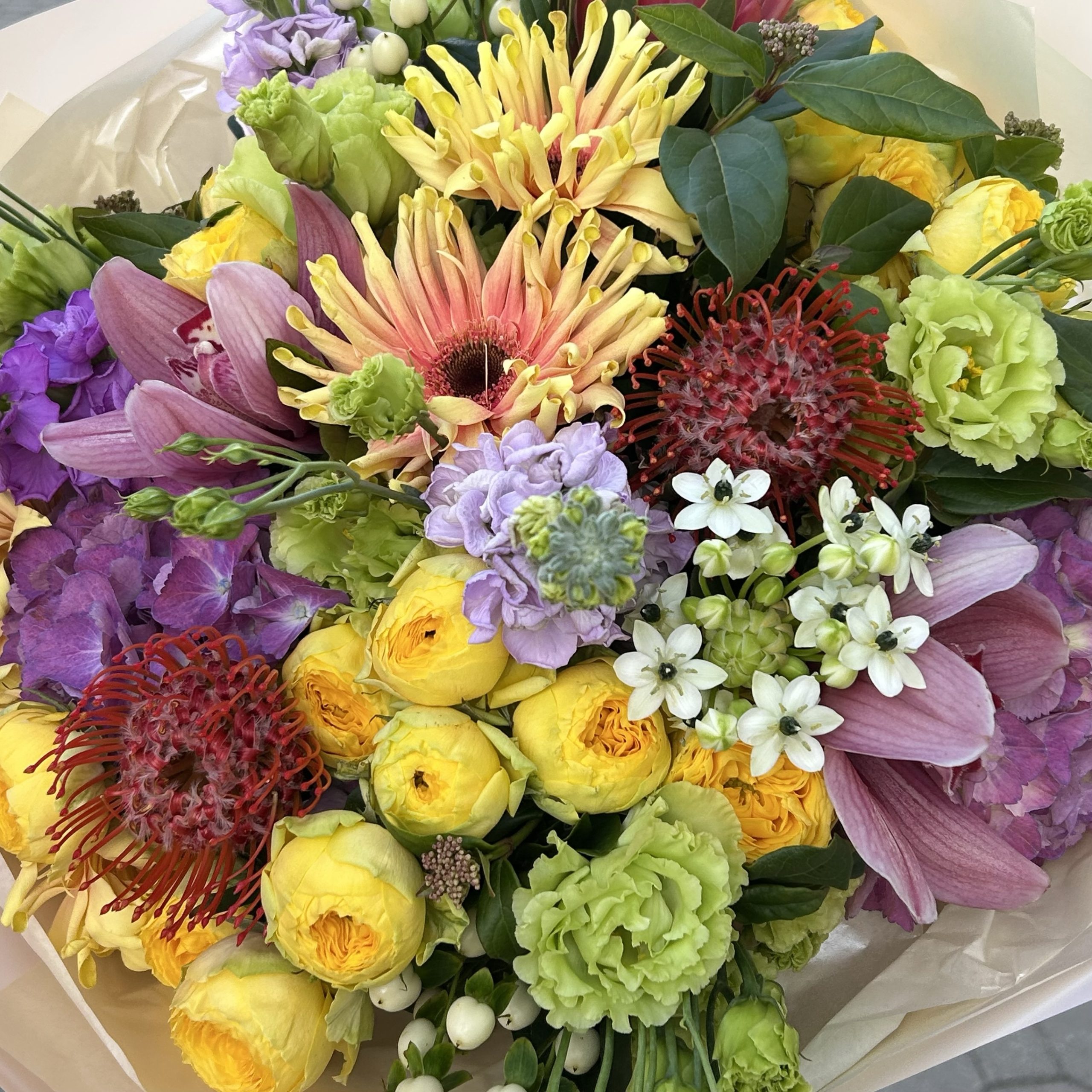 Skład bukietu: protea, leucospermum, hortensja, orchidea, róża gałązkowa, eustoma, gerbera, dodatki sezonowe, papier dekoracyjny
