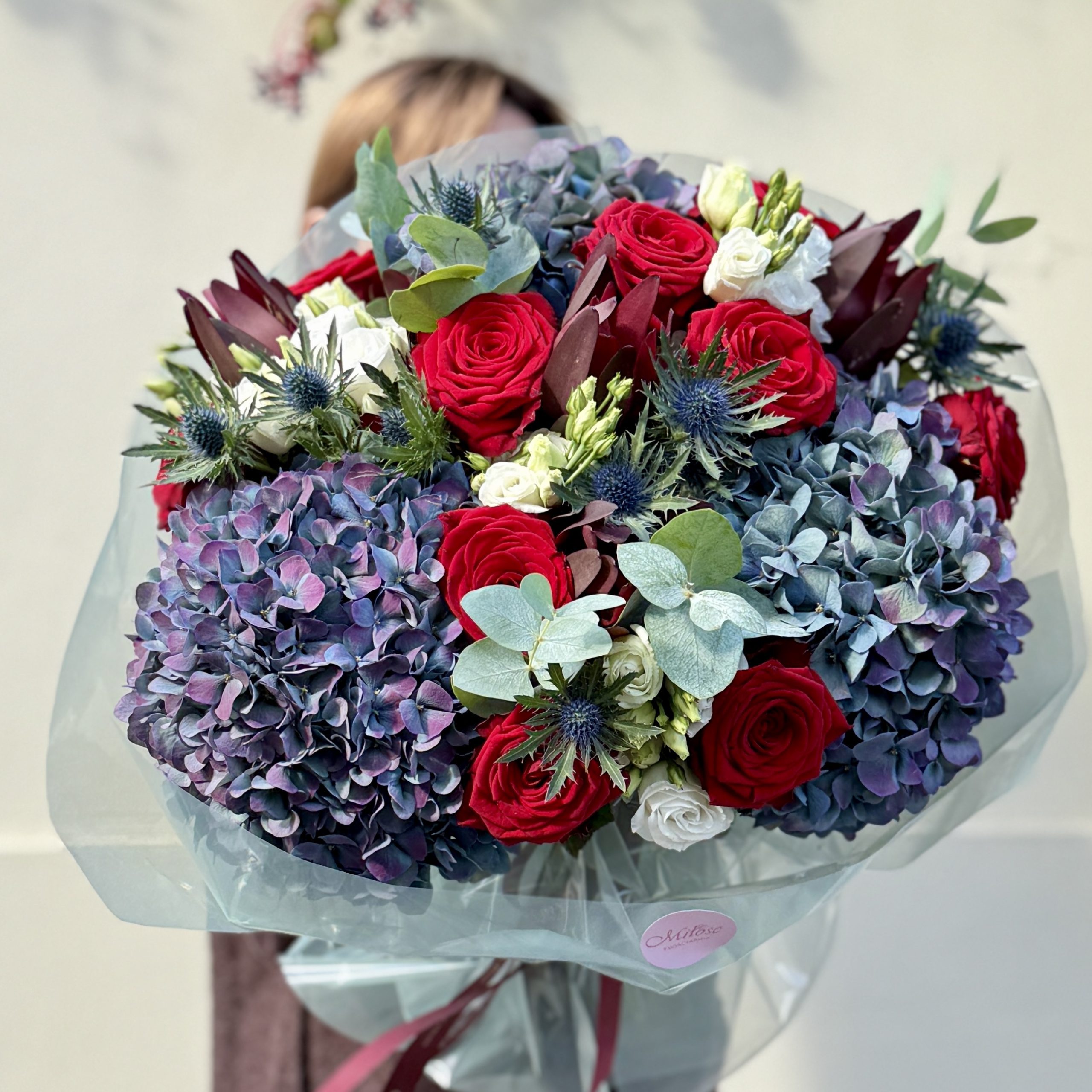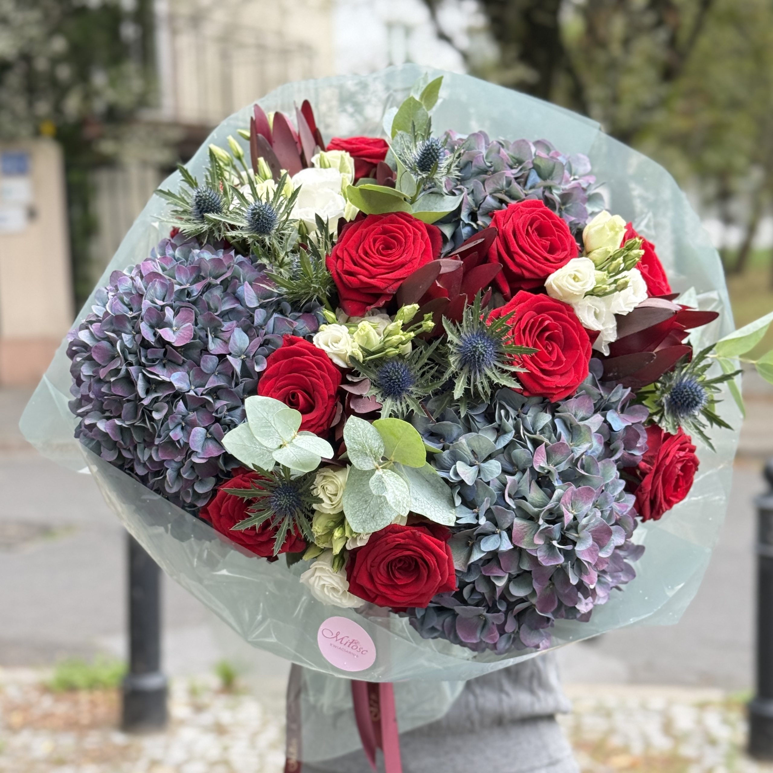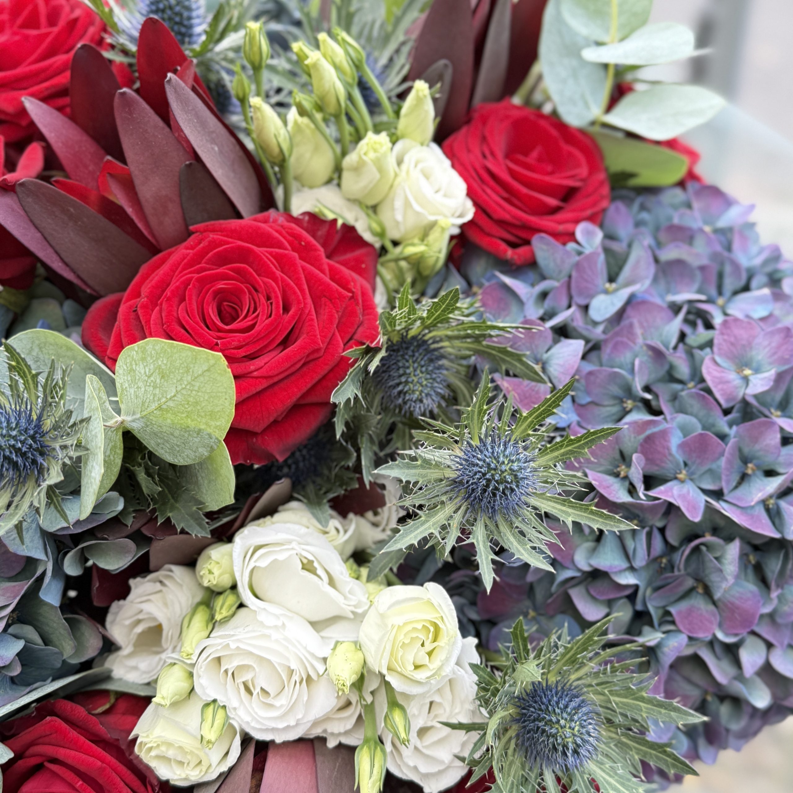 Elegancka i kontrastowa kompozycja, w której połączenie głębokiej czerwieni róż z intensywną hortensją w kolorze morskiej fali tworzy wyjątkowy efekt. Całość uzupełniają białe eustomy, leucadendron, mikołajki oraz eukaliptus, które nadają bukietowi nowoczesnego charakteru i głębi.