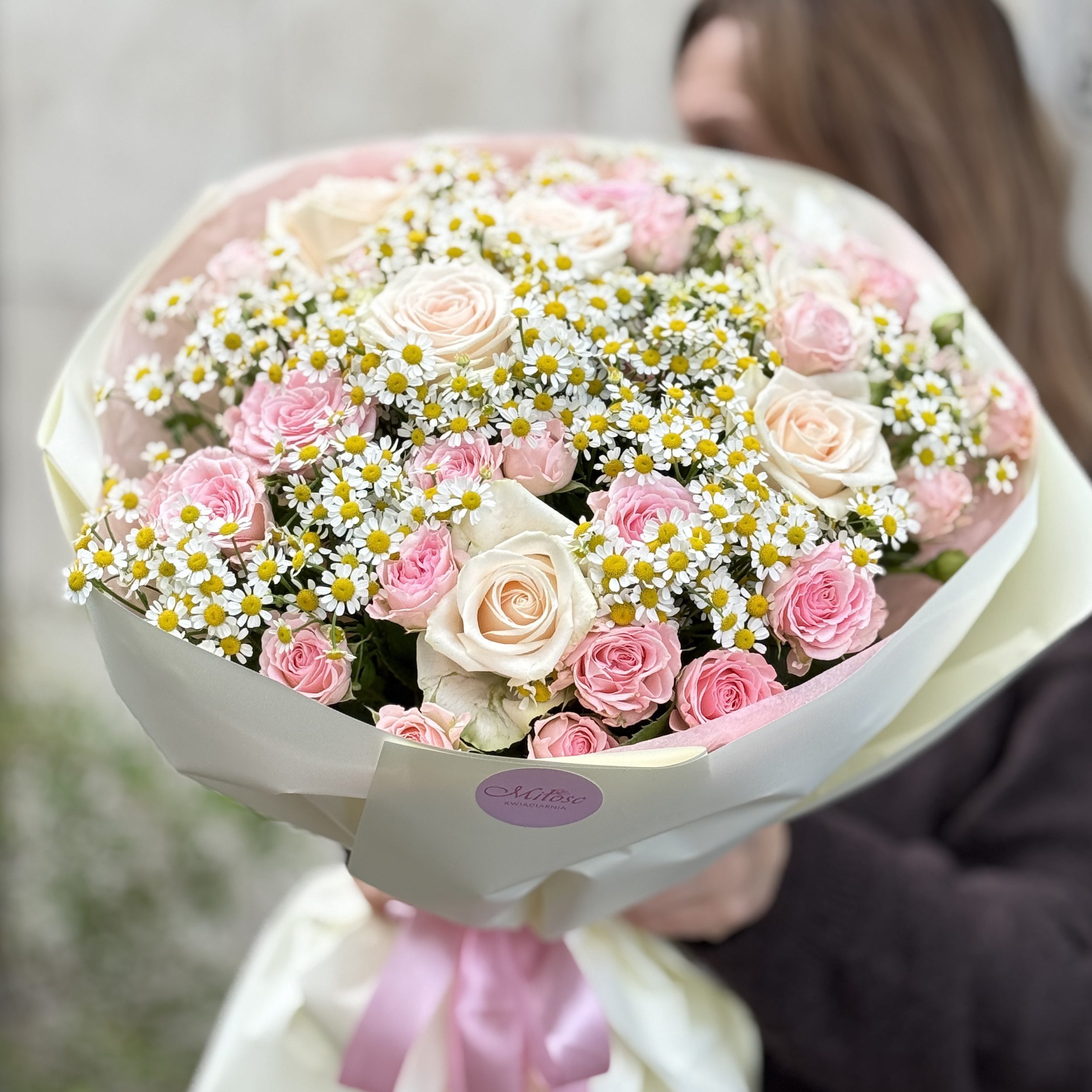 W skład bukietu wchodzą rumianek, róża gałązkowa oraz róża klasyczna.