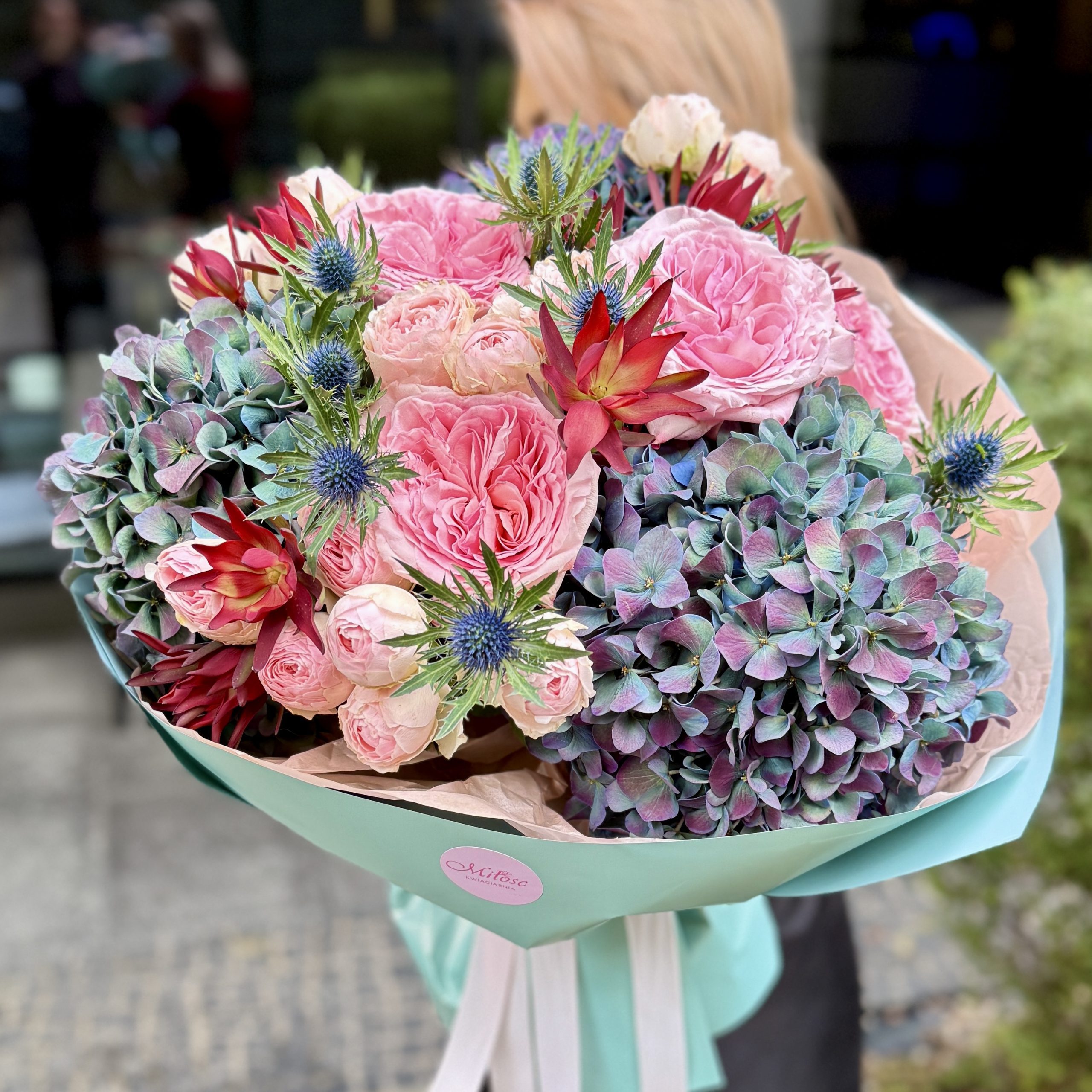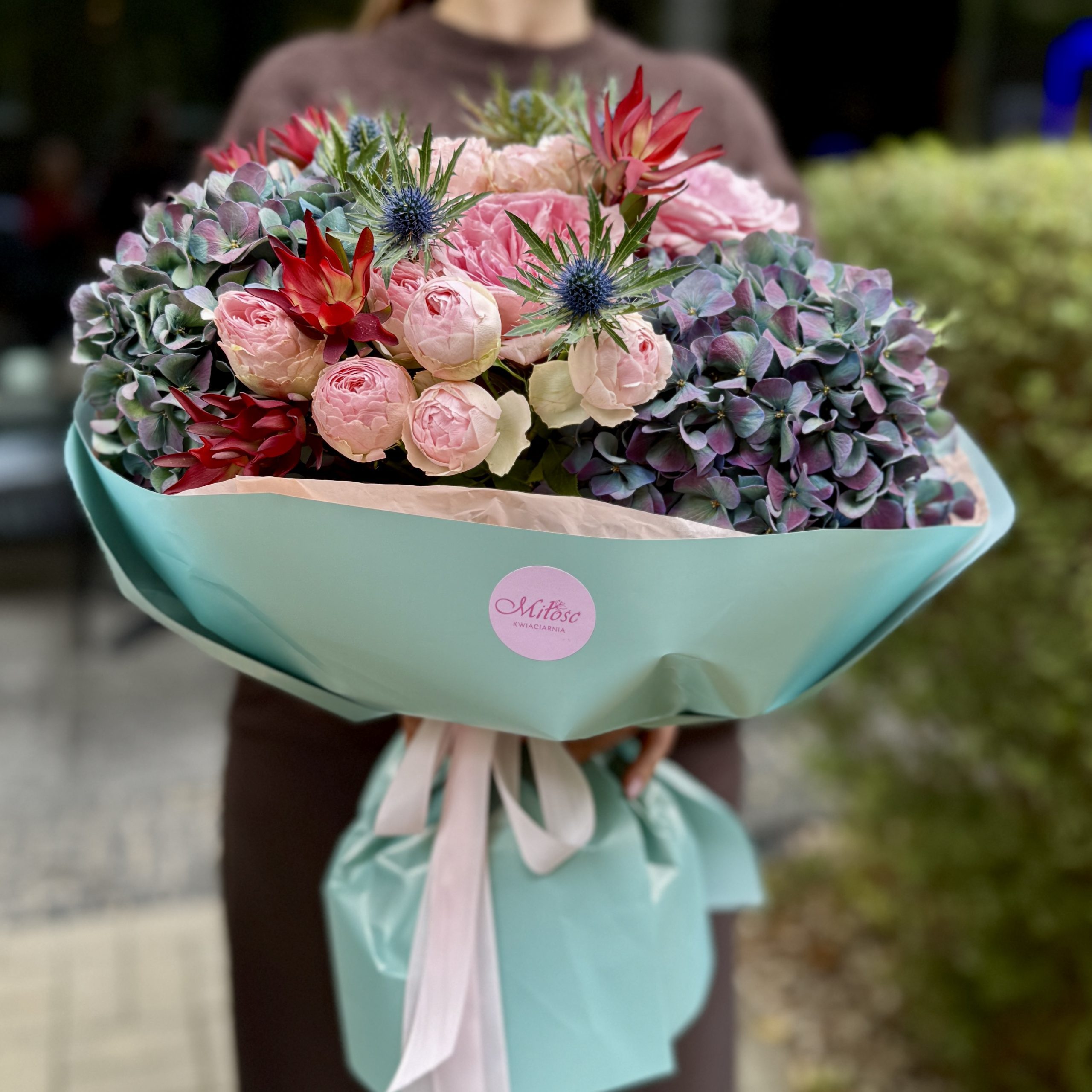Wyjątkowa kompozycja łącząca subtelny róż róż piwoniowych z intensywnymi hortensjami w odcieniach morskiej fali. Dodatkowo mikołajki i egzotyczne akcenty nadają całości nowoczesnego charakteru, a bukiet staje się harmonijnym połączeniem elegancji i świeżości.