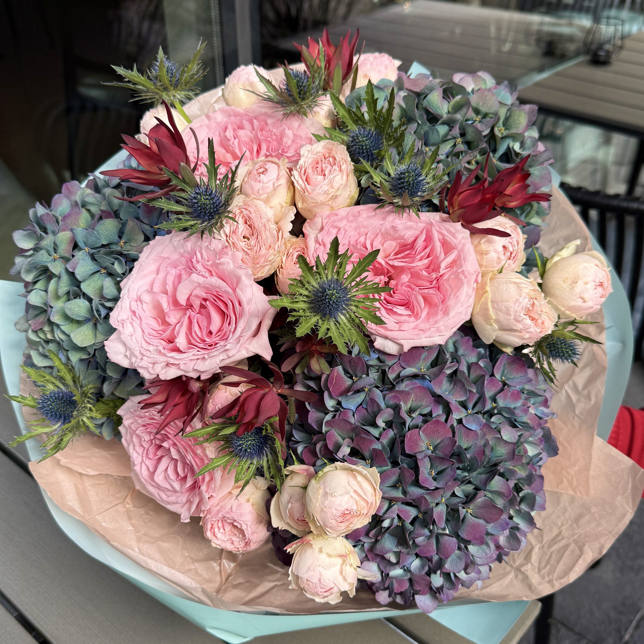 Skład bukietu: hortensja w kolorze morskiej fali, róża piwoniowa różowa, róża gałązkowa, mikołajki, egzotyczne dodatki, papier ozdobny