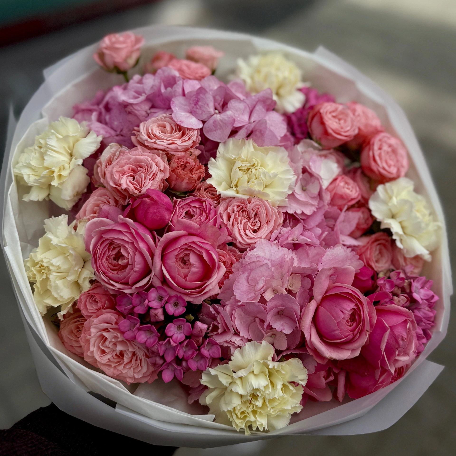 Skład: róże klasyczne i gałązkowe, hortensja, goździki, delikatne kwiaty sezonowe w odcieniach różu, ozdobny papier, wstążka.