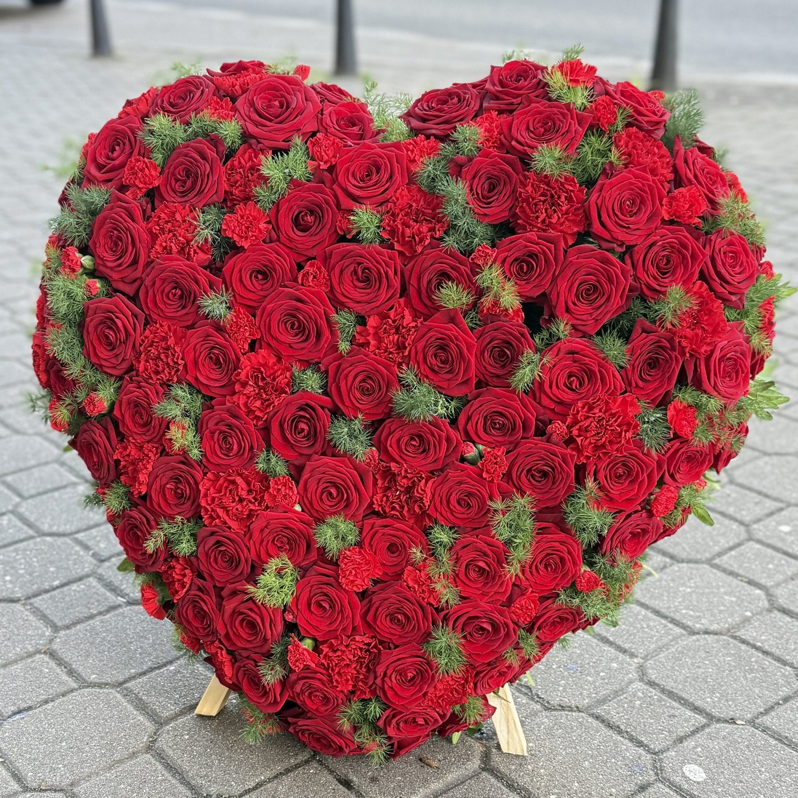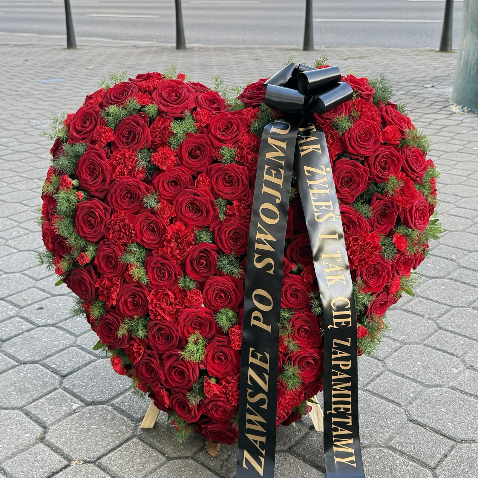 Eleganckie serce kwiatowe stworzone ze 100 czerwonych róż oraz goździków — kompozycja pełna symboliki, idealna na pożegnanie bliskiej osoby.