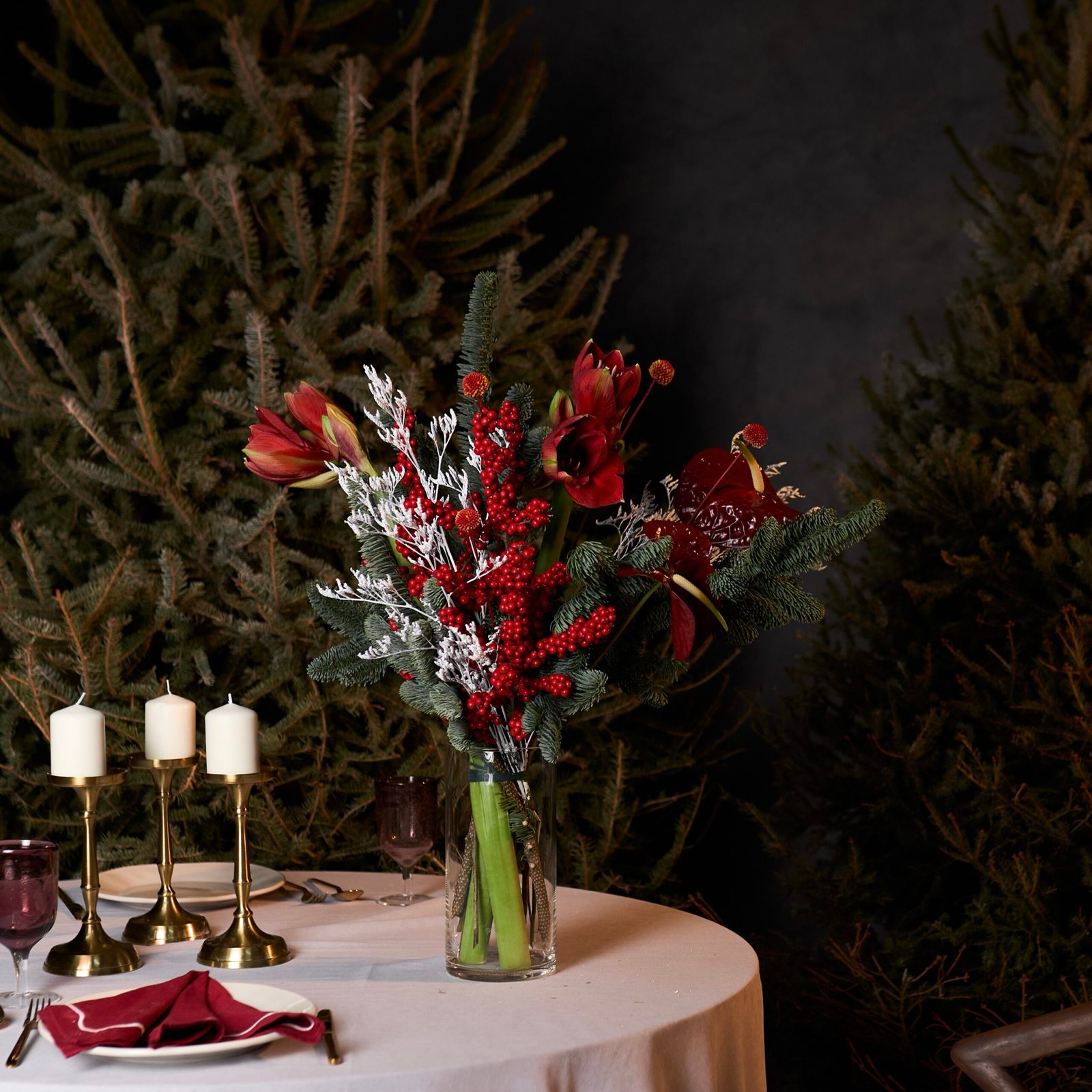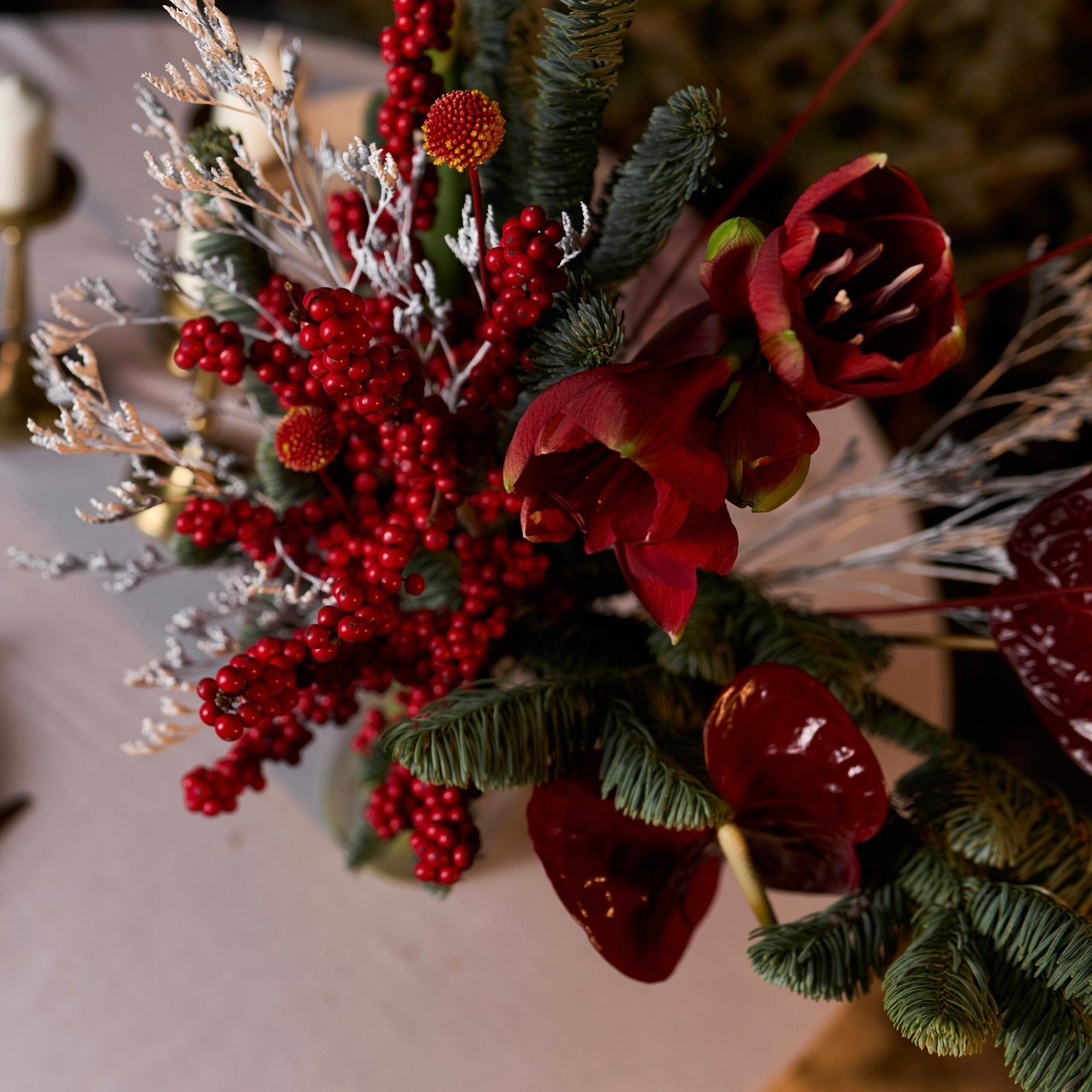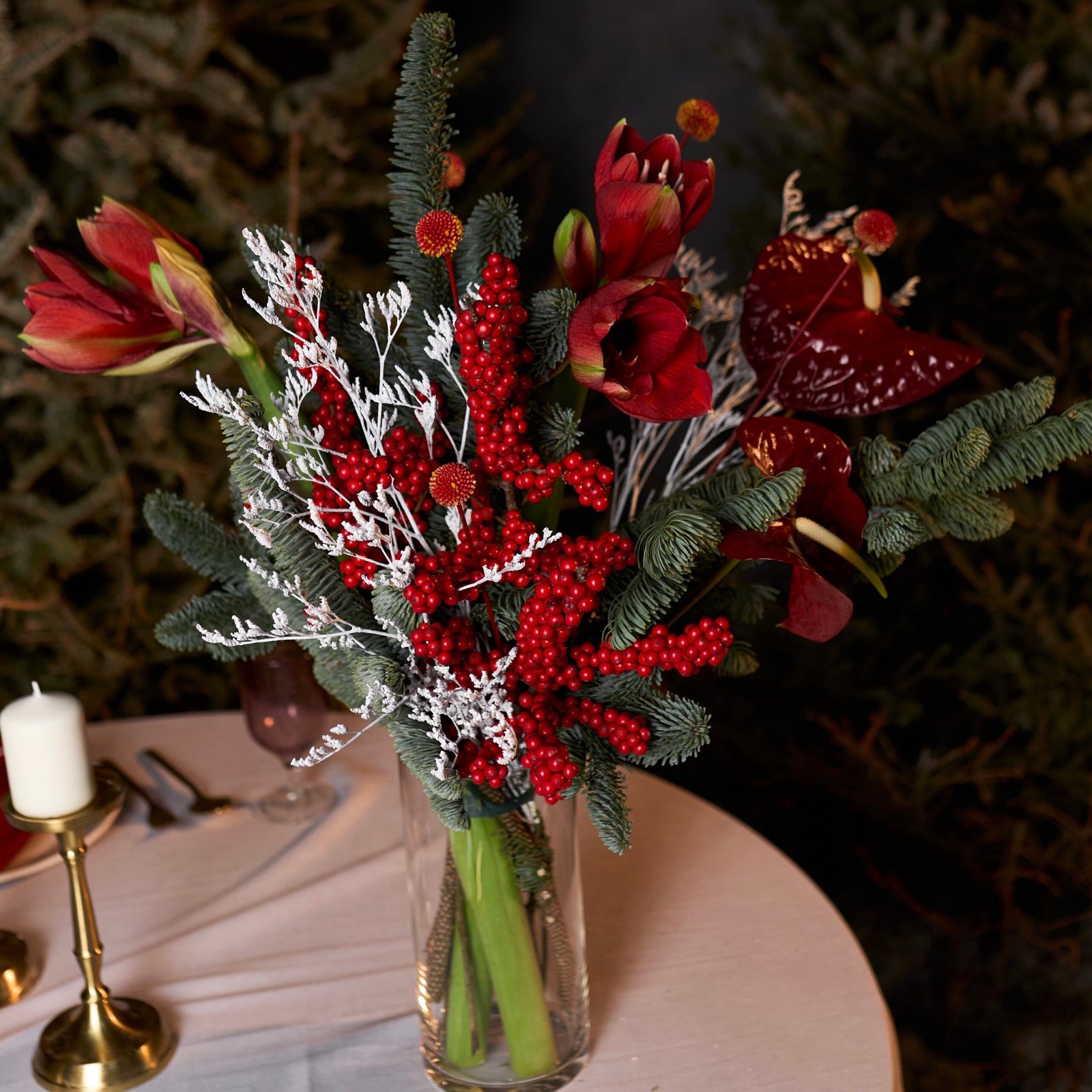 Głębokie odcienie czerwieni w połączeniu z intensywną zielenią iglastą i subtelnymi, srebrzystymi akcentami tworzą elegancką, nastrojową aranżację idealną na zimowy czas. Amarylis i anturium nadają kompozycji charakteru oraz szlachetności, a czerwony ilex podkreśla świąteczny klimat. Całość prezentuje się stylowo, dekoracyjnie i bardzo efektownie — doskonała propozycja do wnętrz oraz na świąteczny stół.